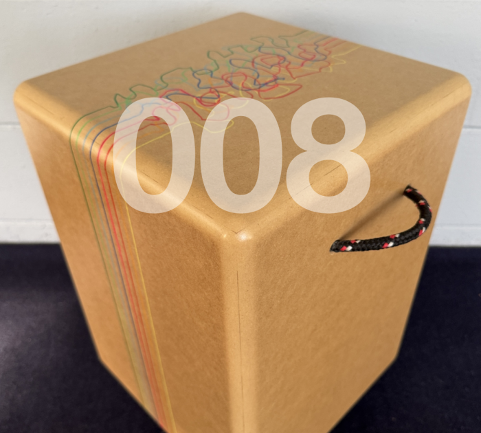 Image of a cubic stool with number 006 in front. stool has short black lesson the bottom. Entire stool is wrapped in canvas and painted. The painting is blue on top, white in the middle, and goldenrod color on the bottom.